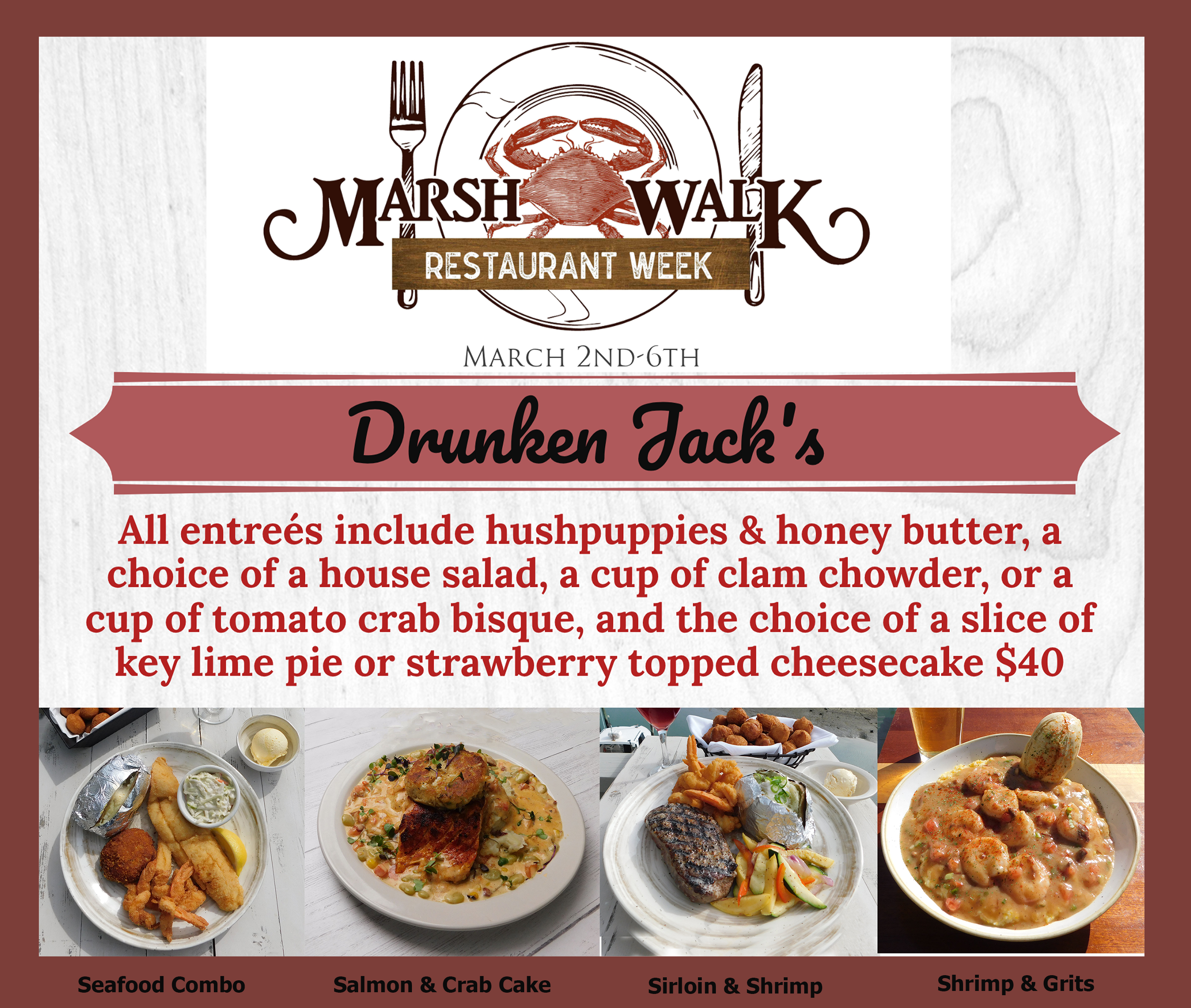 Learn More & Apply for jobWelcome to Drunken Jack’s, the home to the freshest seafood in Murrells Inlet, the seafood capital of South Carolina, where we have made our home since 1979! A lot has changed over the years but the one thing that has remained constant is our commitment to serving the best seafood on the Marshwalk. We look forward to having the opportunity to impress you on your next visit!